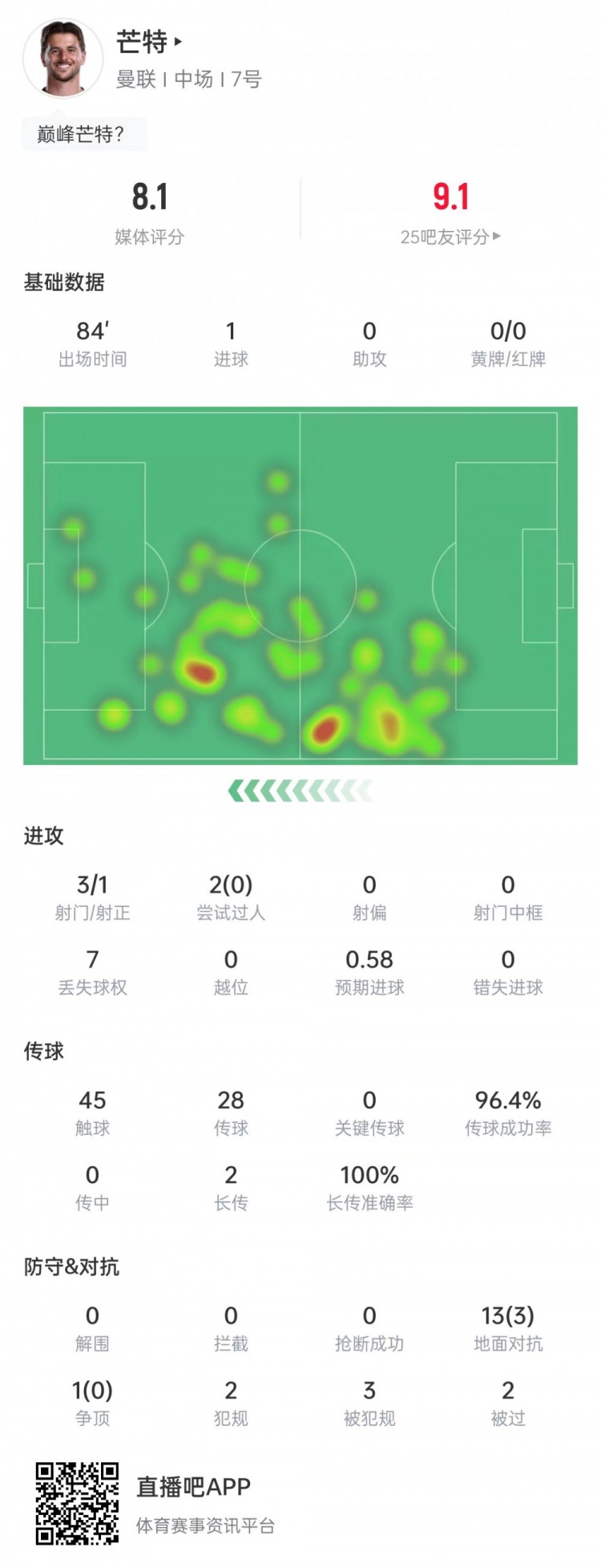 芒特本场数据:3次射门打进1球,传球成功率96.4%,获评8.1分